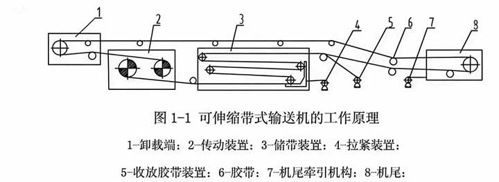 可伸皮帶輸送機(jī)與普通膠帶輸送機(jī)的工作原理一樣,是以膠帶作為牽引承載機(jī)的連續(xù)運(yùn)輸設(shè)備,它與普通膠帶輸送機(jī)相比增加了儲帶裝置和收放膠帶裝置等,當(dāng)游動小車向機(jī)尾一端移動時,膠帶進(jìn)入儲帶裝置,機(jī)尾回縮;反之則機(jī)尾延伸,因而使輸送機(jī)具有可伸縮的性能。
