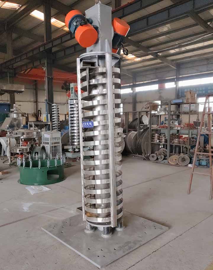 DZC系列垂直振動輸送機的驅動裝置振動電機安裝在輸送塔下部,兩臺振動電機對稱交叉安裝,輸送塔由管體和焊接在管體周圍的螺旋輸送槽組成,輸送塔座于減振裝置上,減振裝置由底座和隔振彈簧組成。當垂直輸送機工作時,根據雙振動電機自同步原理,由振動電機產生激振力,強迫整個輸送塔體作水平圓運動和向上垂直運動的空間復合振動,螺旋槽內的物料則受輸送槽的作用,作勻速拋擲圓運動,沿輸送槽體向上運動,從而完成物料的向上(或向下)輸送作業。