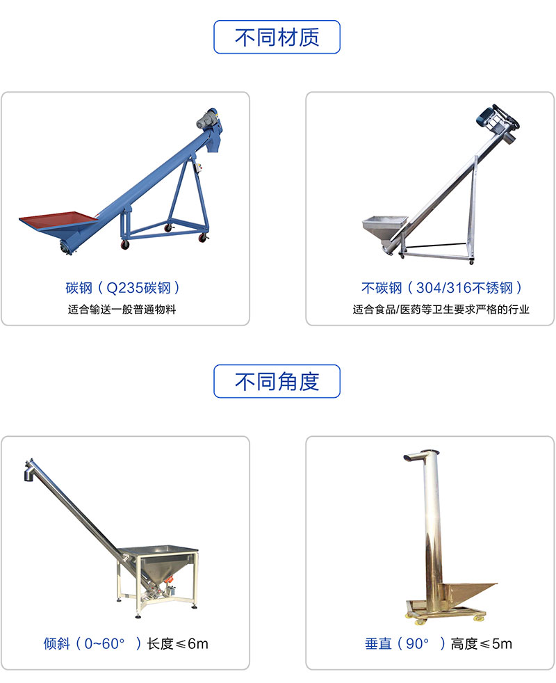 垂直螺旋給料機(jī):90°垂直向上輸送物料,轉(zhuǎn)速比普通螺旋輸送機(jī)要高,提升高度一般不大于8米。